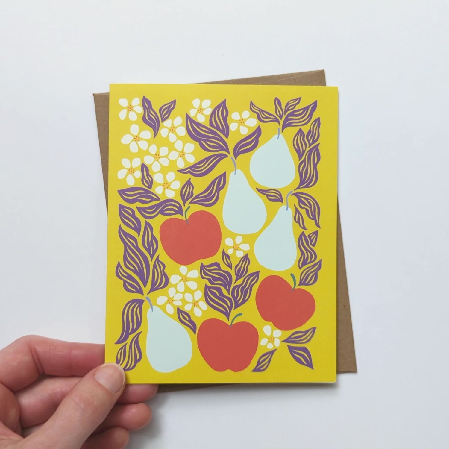 Brighten someone’s day with this whimsical greeting card featuring original art of apples and pears. Part of our colorful Farmers Market collection, this blank card is perfect for birthday wishes, thank you notes, sympathy messages, or just because notes.