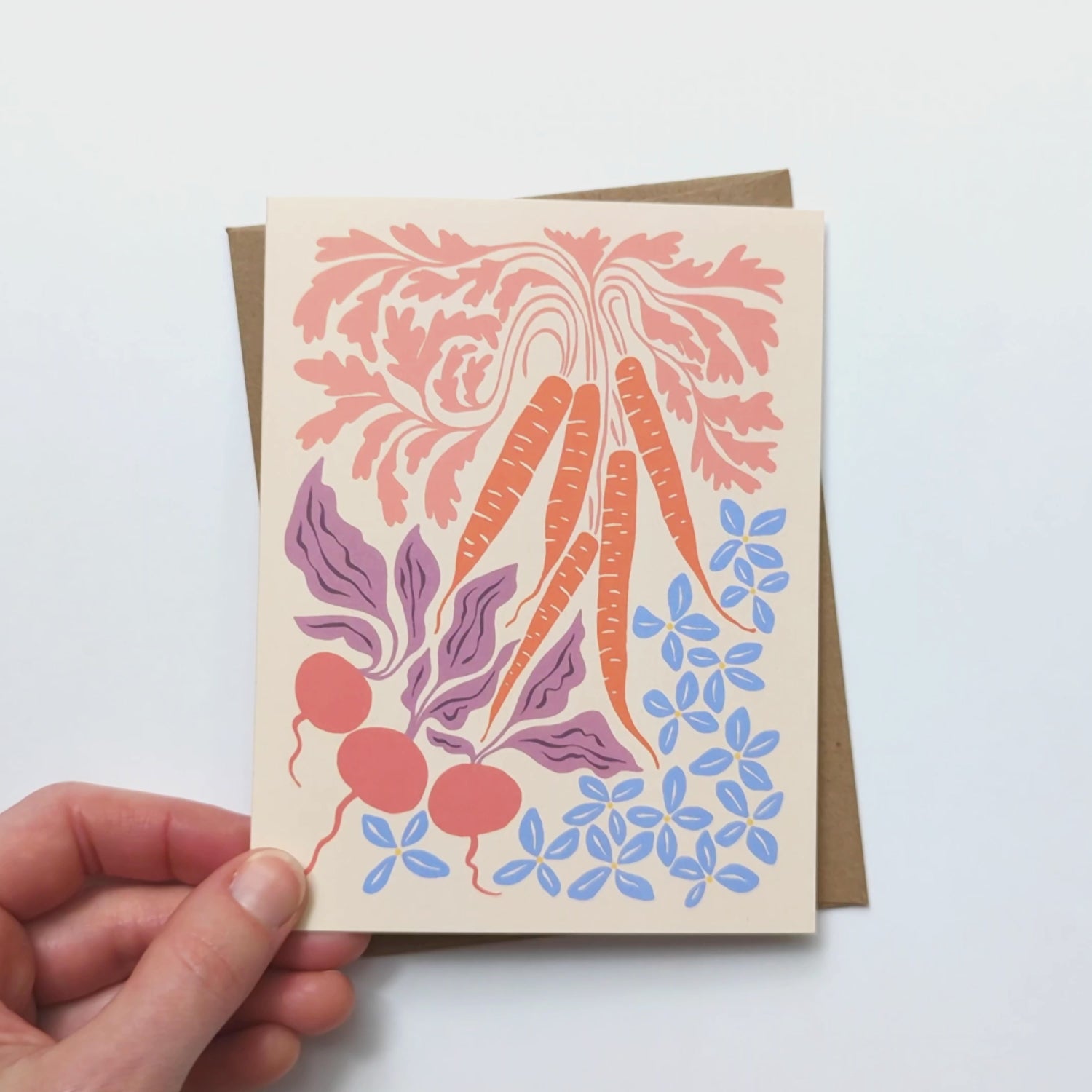 Brighten someone’s day with this whimsical greeting card featuring original art of carrots and radishes. Part of our colorful Farmers Market collection, this blank card is perfect for birthday wishes, thank you notes, sympathy messages, or just because notes.