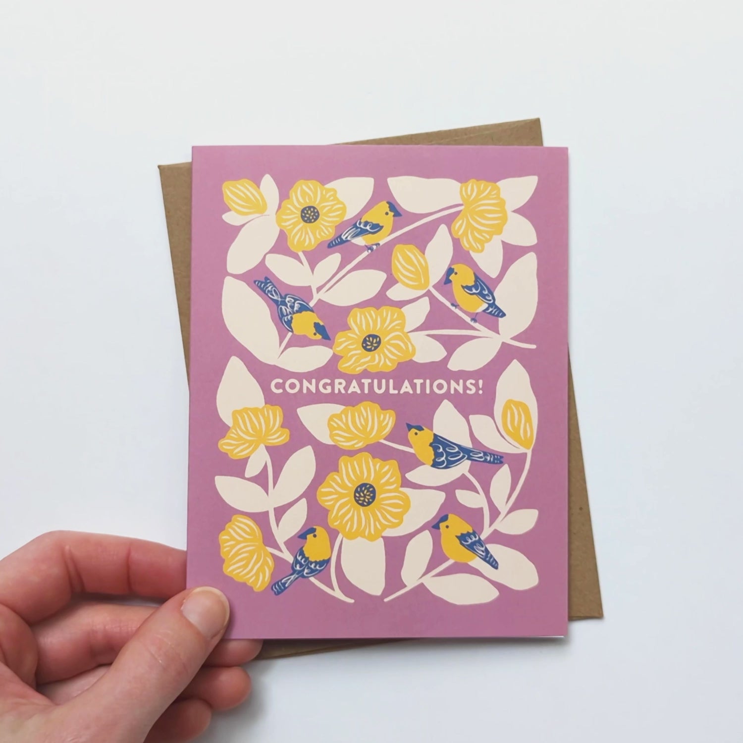 Brighten someone’s day with this whimsical congratulations card featuring original art of goldfinches and magnolia flowers. Part of our colorful collection of bird-themed cards, this blank card is the perfect place to share your congratulations!