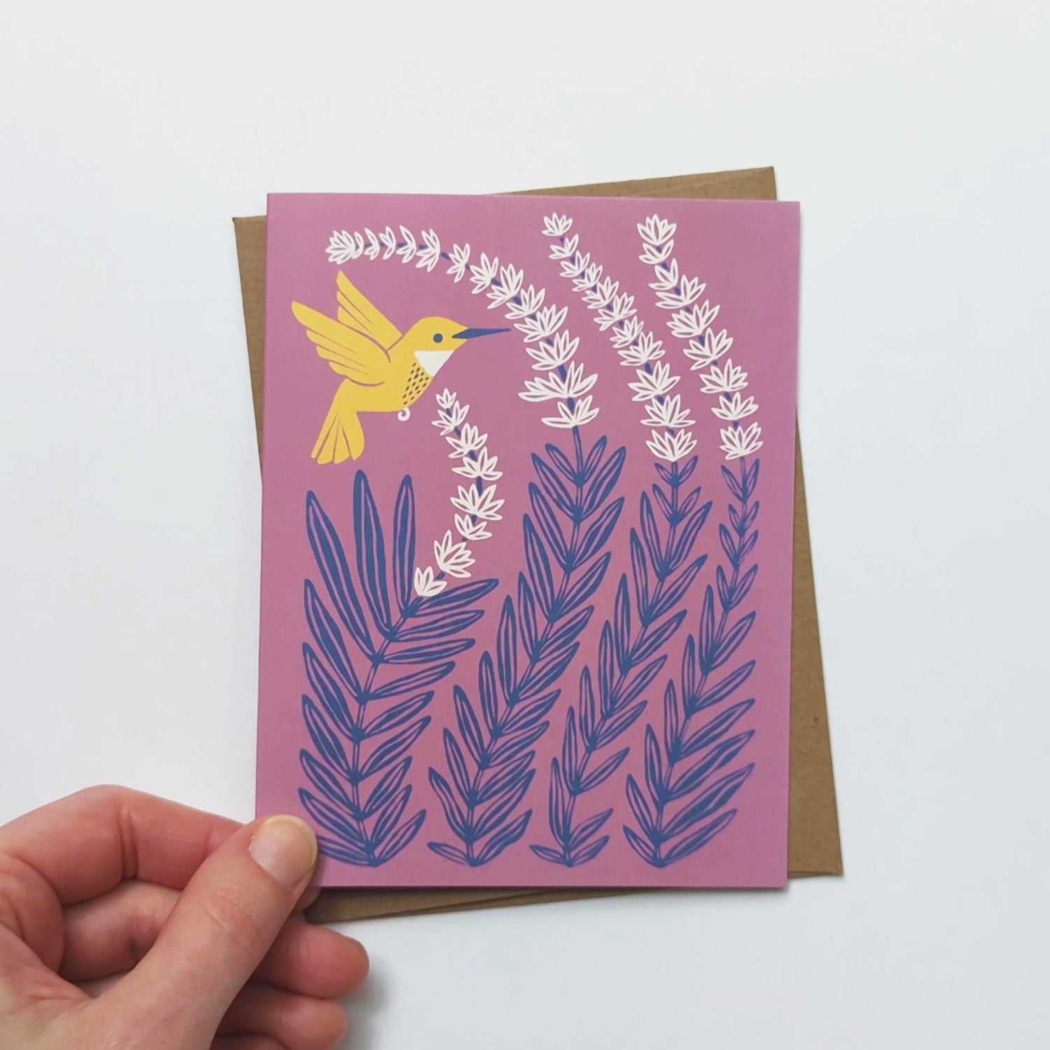 Brighten someone’s day with this whimsical greeting card featuring original art of a hummingbird and flowering lavender. Part of our colorful Birds & Blooms collection, this blank card is perfect for birthday wishes, thank you notes, sympathy messages, or just because notes.