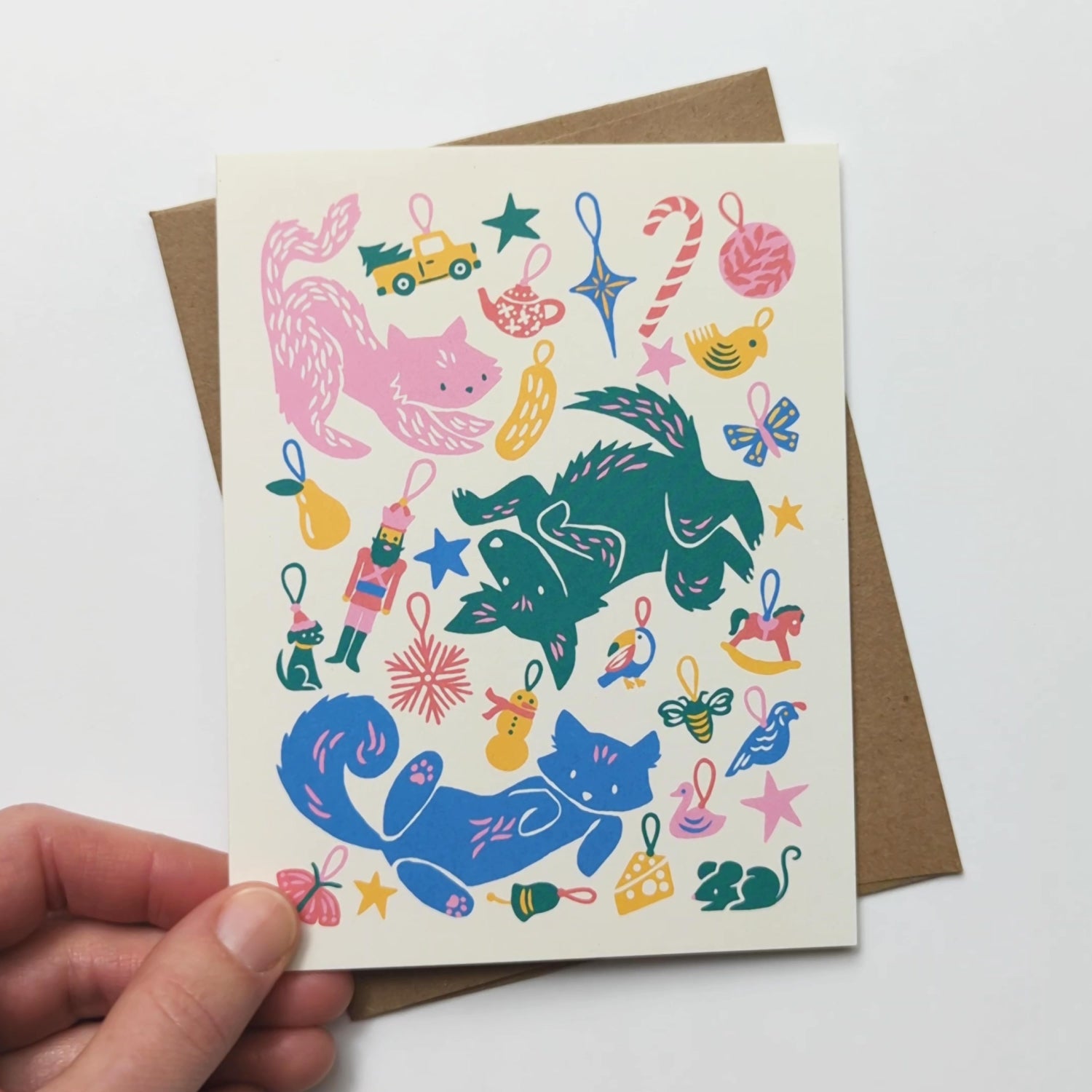 Send Christmas cheer with this holiday card featuring original art of two cats, a dog, and a mouse collecting ornaments for the tree. Part of our festive Merry Pets collection, this blank card is the perfect place to share your holiday greetings with family and friends.