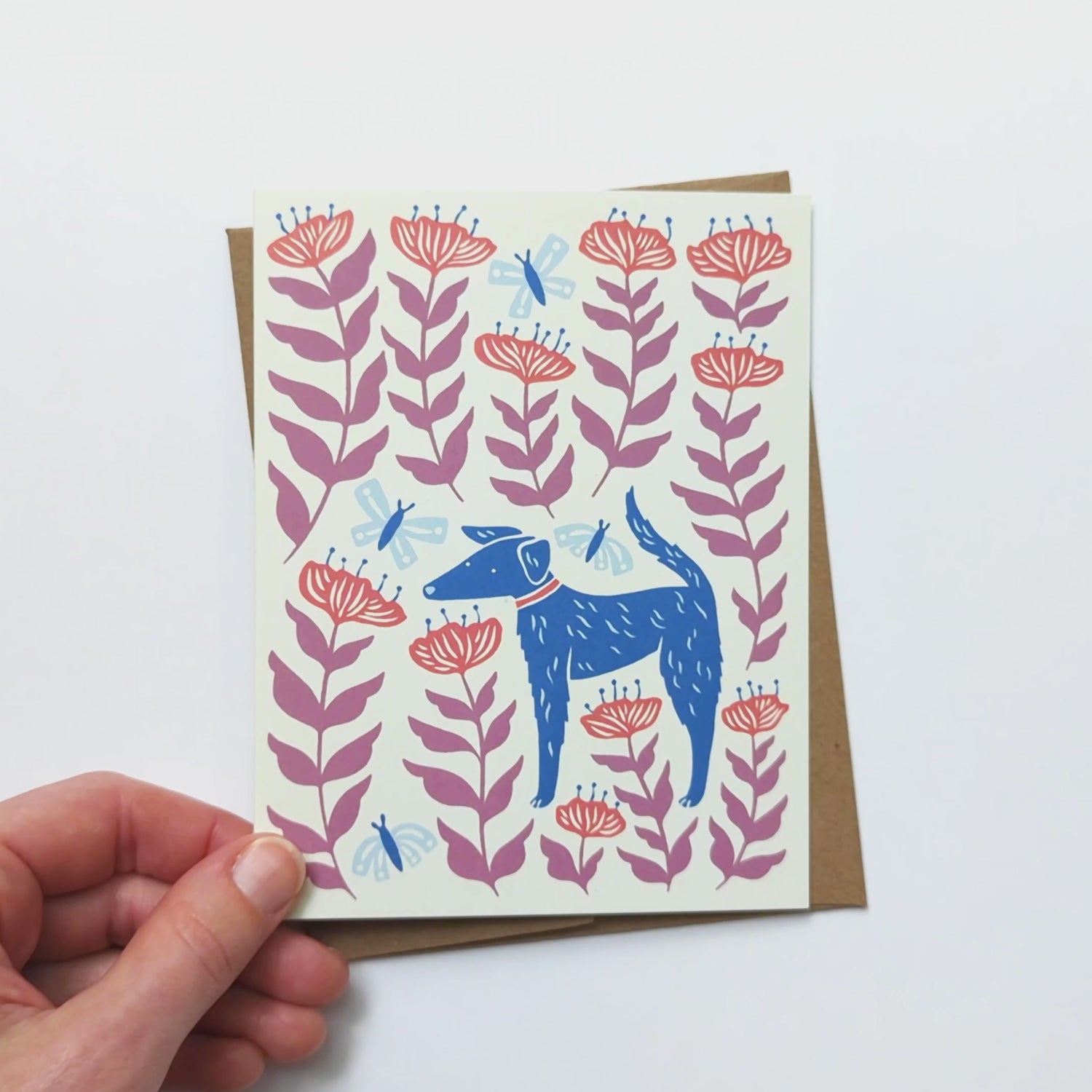 Brighten someone’s day with this whimsical greeting card featuring original art of a dog watching butterflies in a flowering garden. Part of our colorful Dogs & Blooms collection, this blank card is perfect for birthday wishes, thank you notes, sympathy messages, or just because notes.