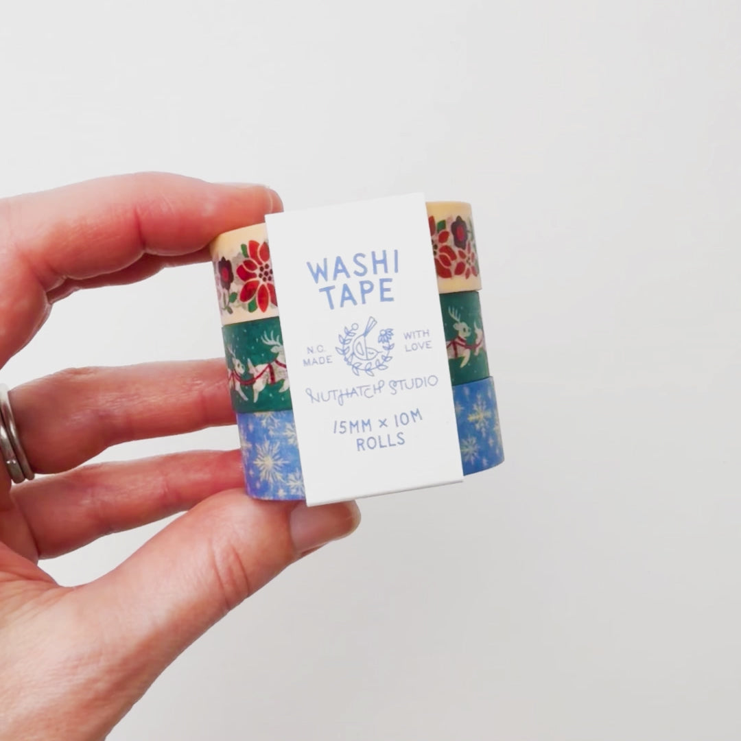 Make your holidays merry and bright with our Night Before Christmas Washi Tape Set. Featuring Santa's sleigh and reindeer, snowflakes, and festive poinsettias, this set of 3 colorful tapes is perfect for decorating holiday cards, gift wrapping, journaling, and scrapbooking. These eco-friendly tapes are made from natural rice paper with soy inks.