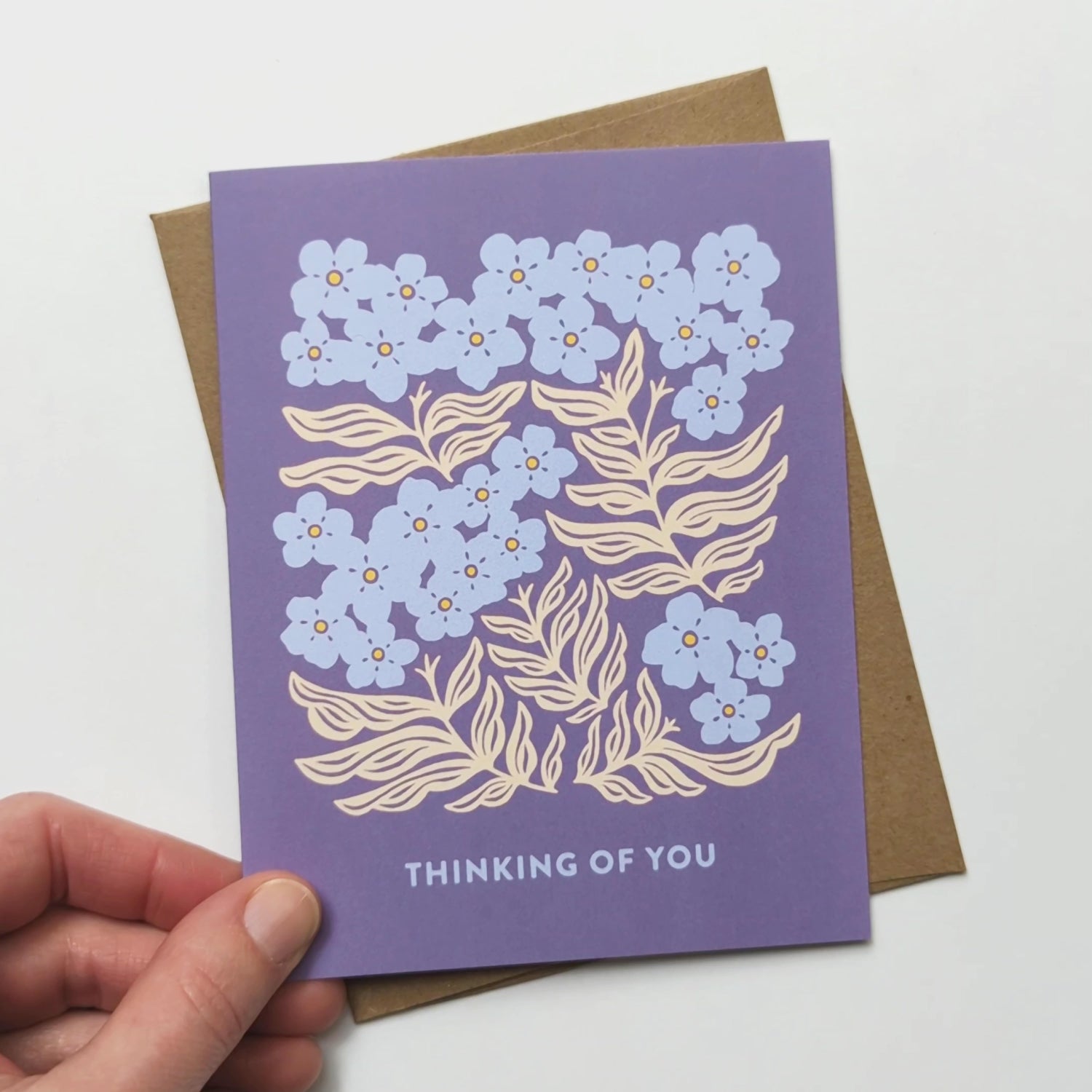 Brighten someone’s day with this floral thinking of you card featuring original art of soft blue forget-me-not flowers. Part of our colorful Flower Garden collection, this blank card is the perfect place to let someone know they’re on your mind.