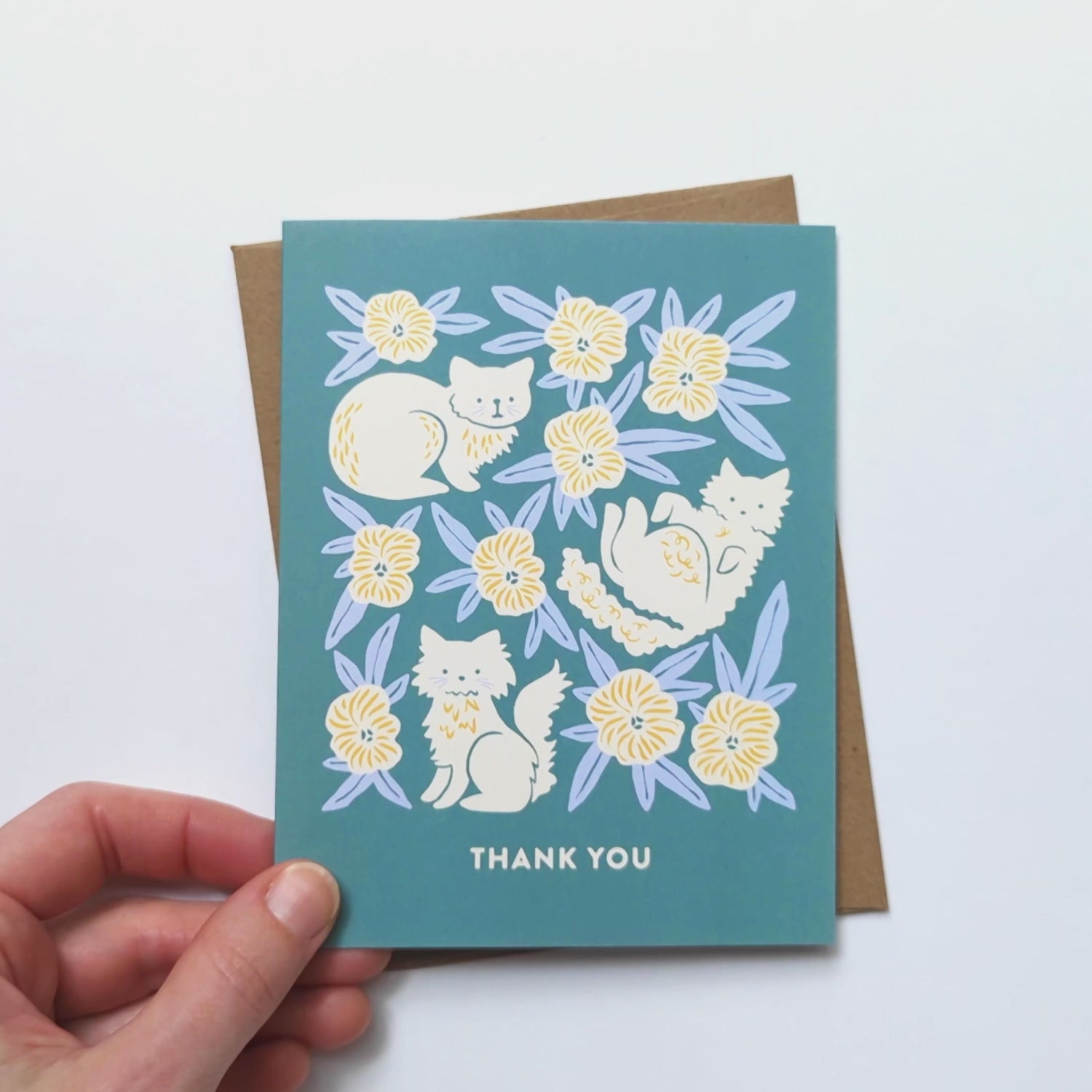 Brighten someone’s day with this whimsical thank you card featuring original art of cats and flowers. Part of our colorful collection of cat-themed cards, this blank card is the perfect place to share your gratitude!
