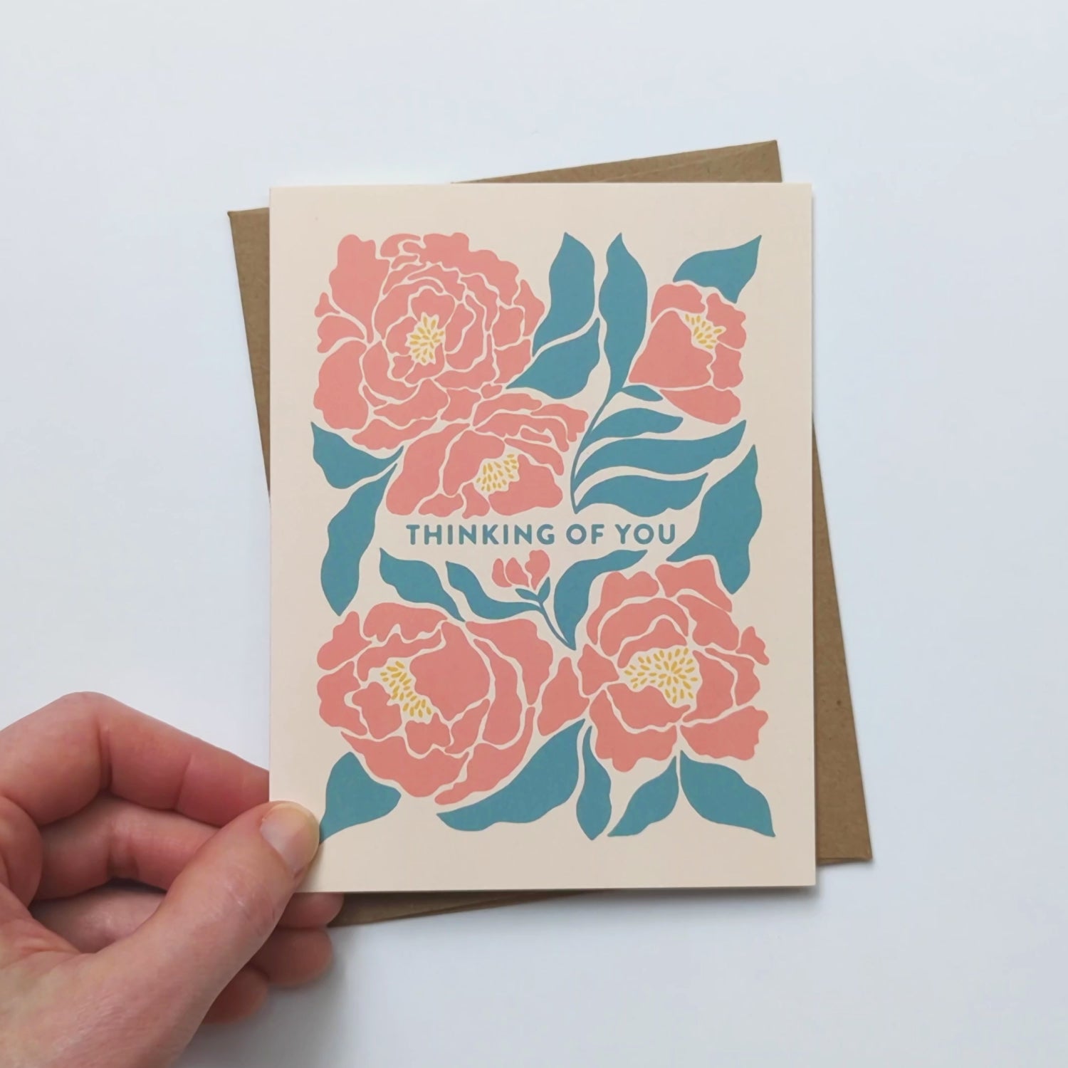 Brighten someone’s day with this floral thinking of you card featuring original art of pink flowering peonies. Part of our colorful Flower Garden collection, this blank card is the perfect place to let someone know they’re on your mind.