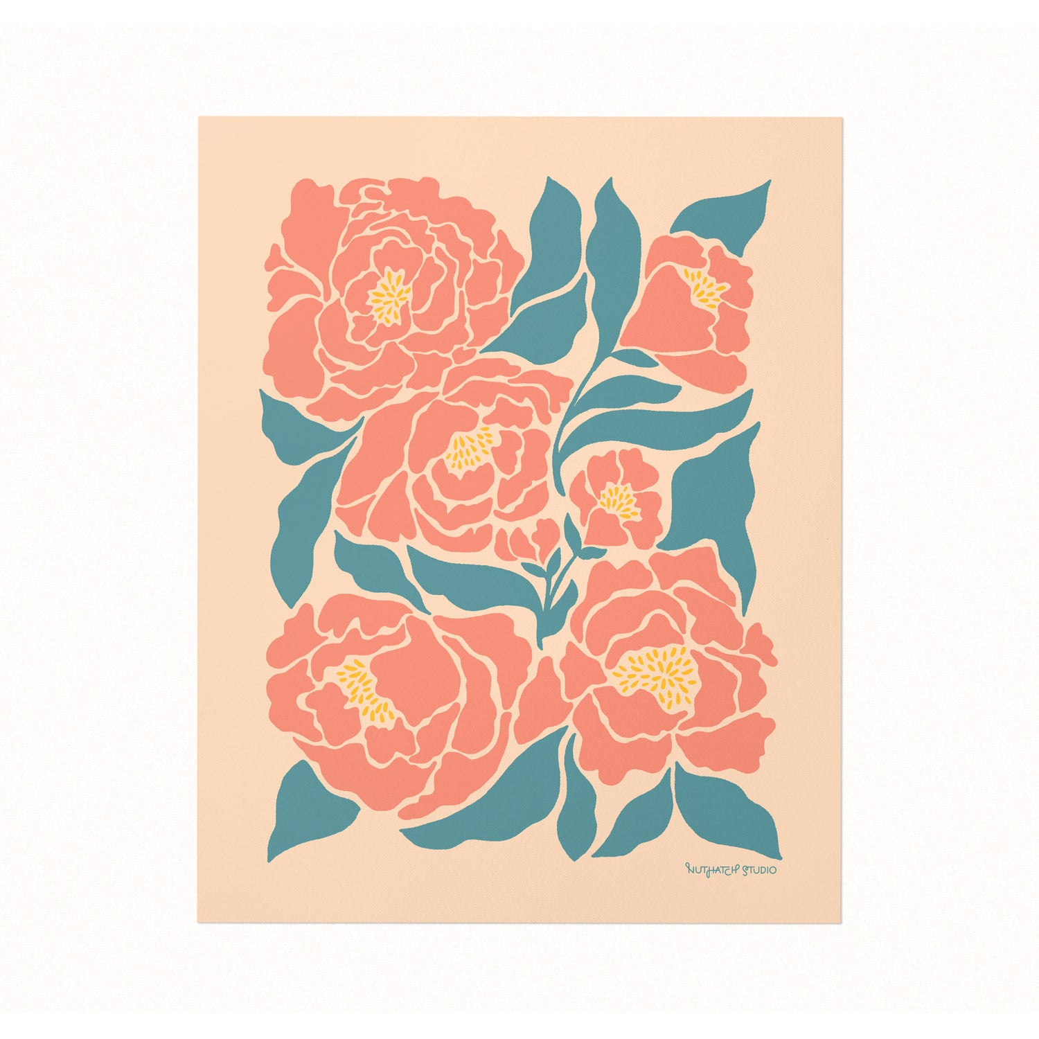 Brighten your space with this art print featuring lush pink peonies on a soft peach background. Romantic, bold, and full of texture. This piece is part of the Flower Garden Collection, an illustrated collection full of movement, texture, and cottagecore charm.