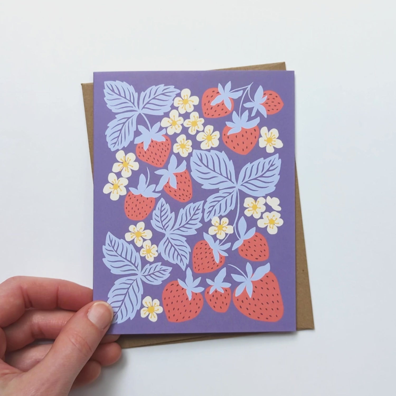 Brighten someone’s day with this whimsical greeting card featuring original art of a flowering strawberry patch. Part of our colorful Farmers Market collection, this blank card is perfect for birthday wishes, thank you notes, sympathy messages, or just because notes.